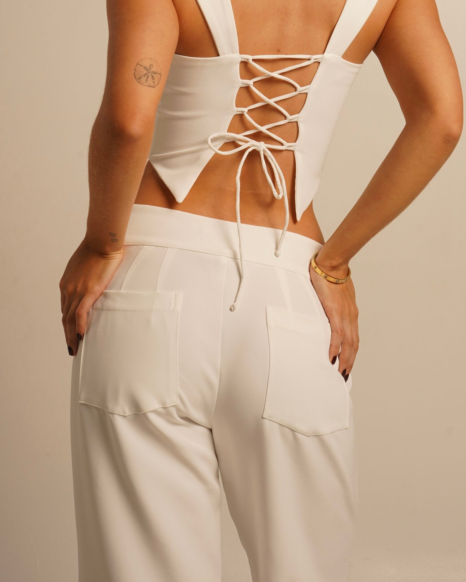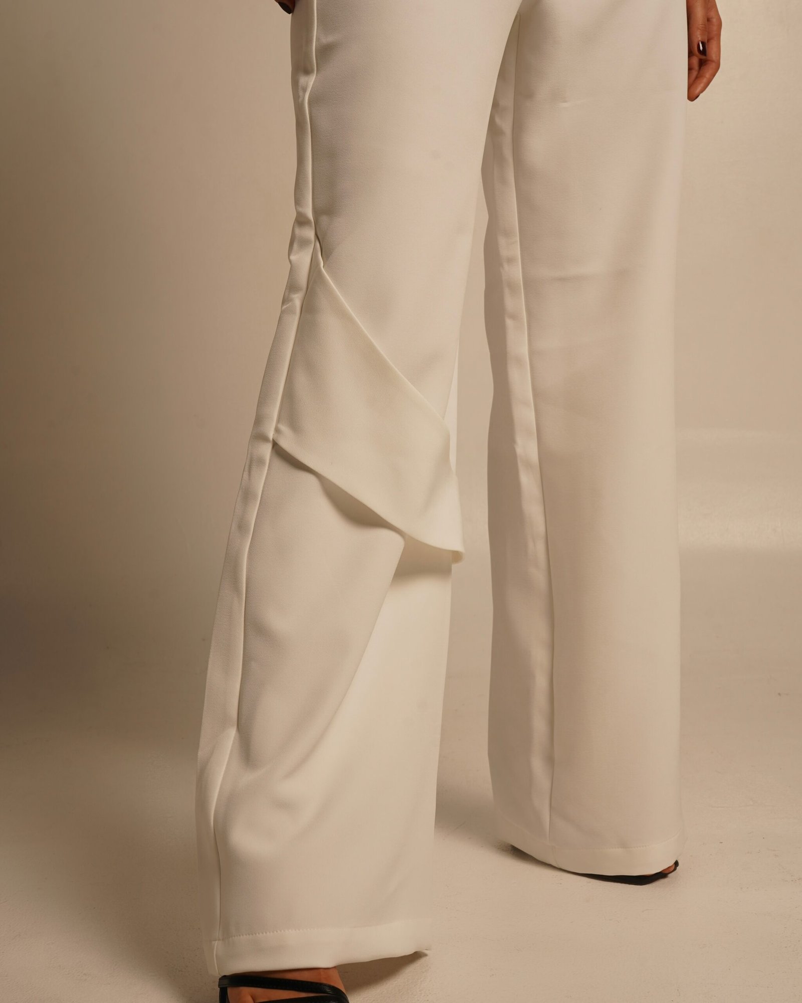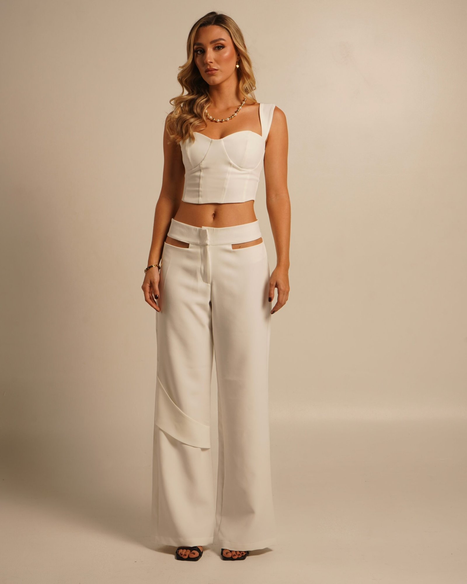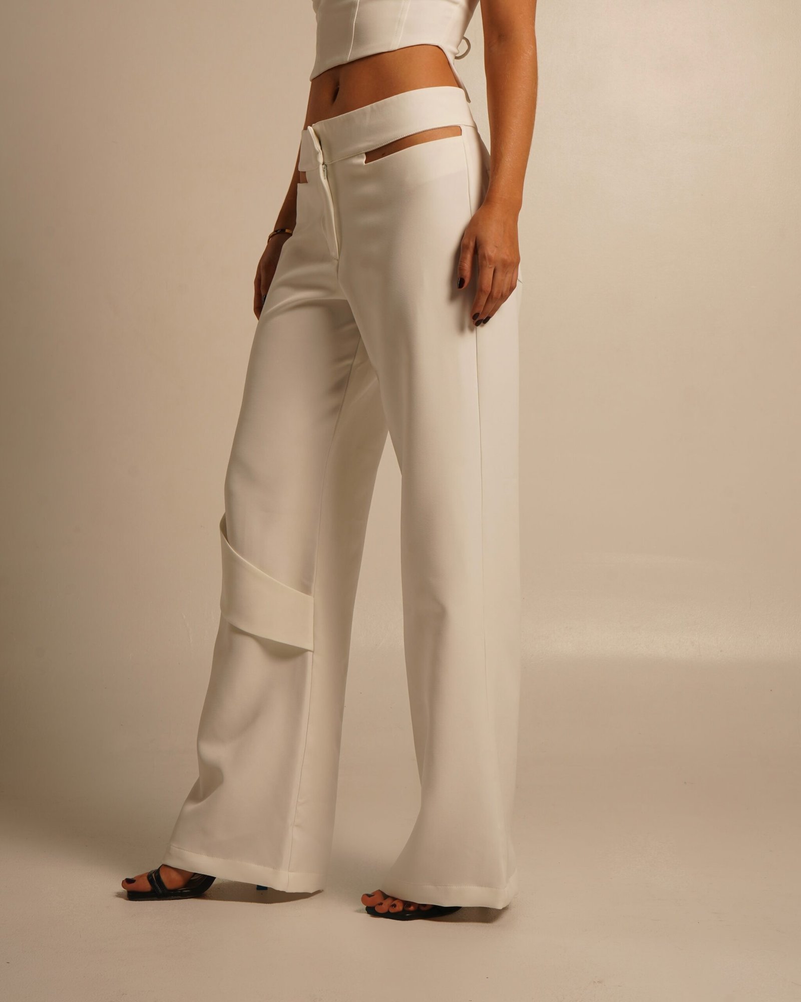 El Pantalón Mael es perfecto para crear un look moderno y estilizado. Cuenta con cut outs frontales delicados que le dan un toque único sin perder elegancia. Su diseño recto–ancho estiliza la figura y aporta fluidez al caminar.