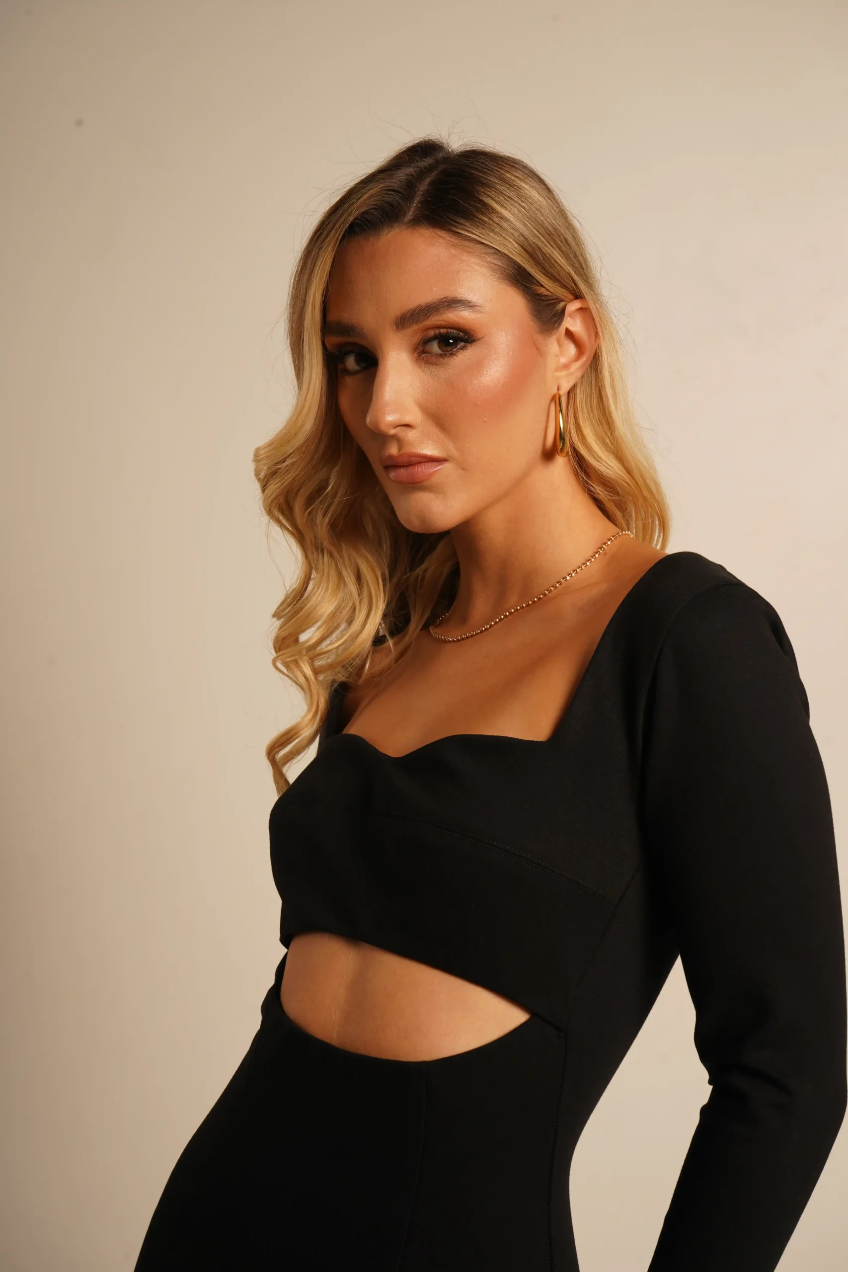 Este vestido es la combinación perfecta de elegancia y modernidad. Con un diseño de manga larga, escote corazón y detalles cut-out, es una pieza única que resalta la silueta de manera sofisticada. Ideal para eventos formales o cenas especiales.
